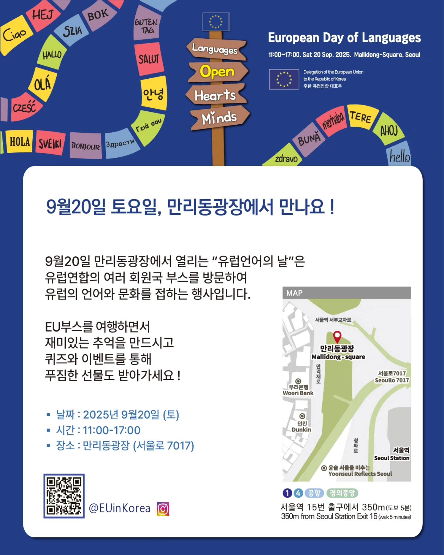 올해 한국에서는 2025년 9월 20일(토) 오전 11시 ~ 오후 5시까지, 서울 만리동 광장(서울로 7017)에서 유럽 언어의 날 행사가 열립니다.